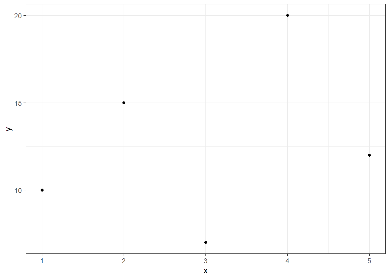 data <- data.frame(x = c(1, 2, 3, 4, 5), y = c(10, 15, 7, 20, 12))